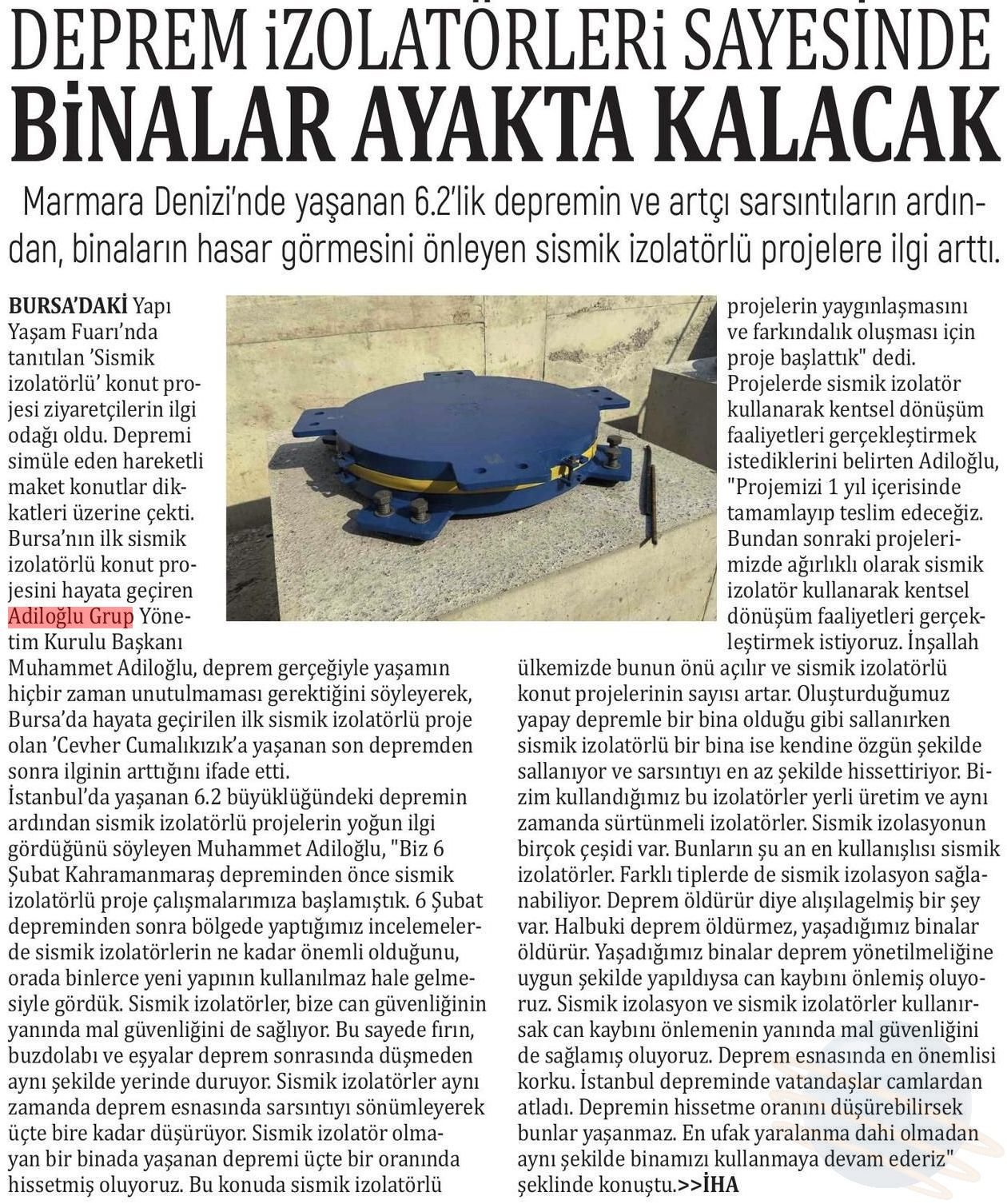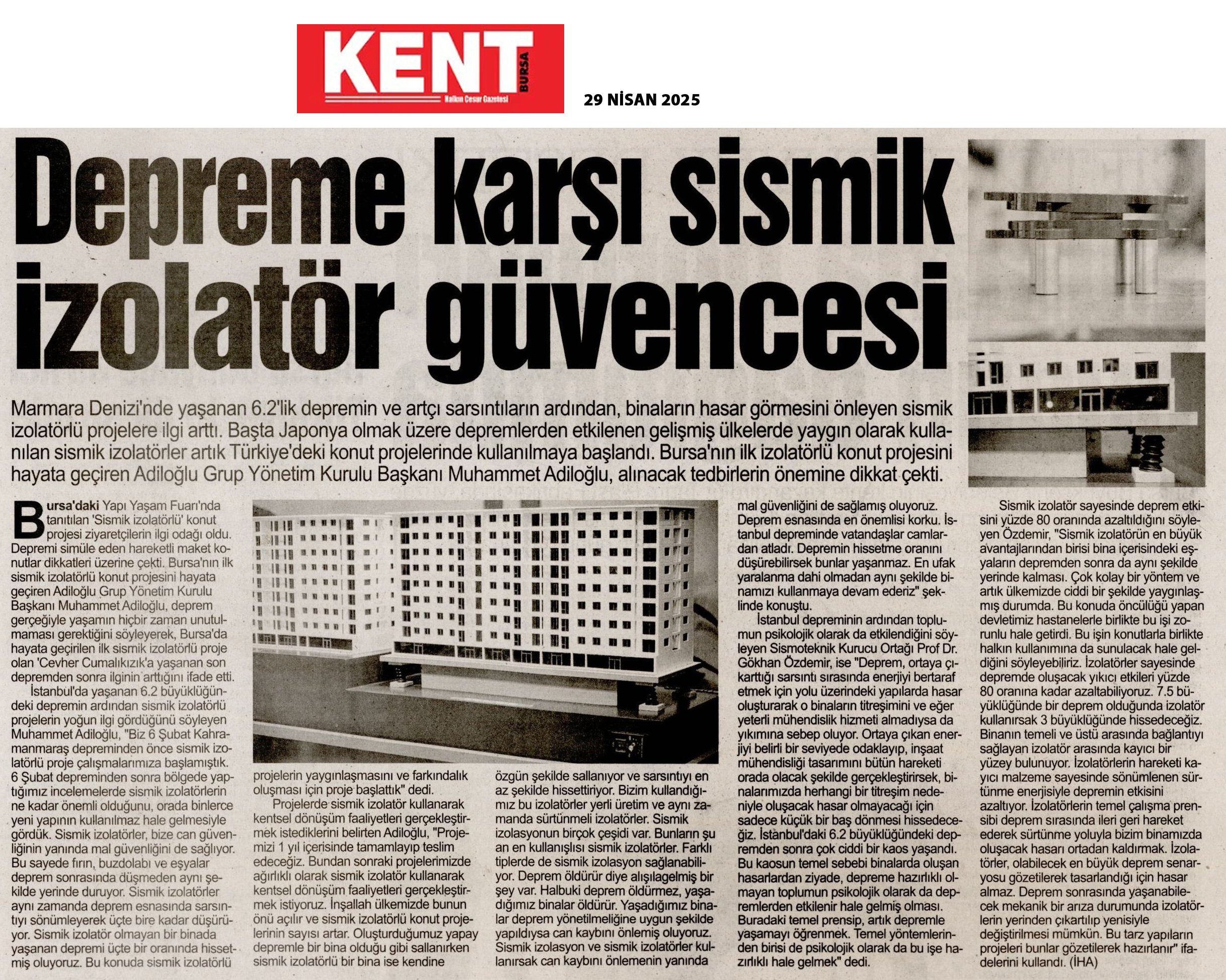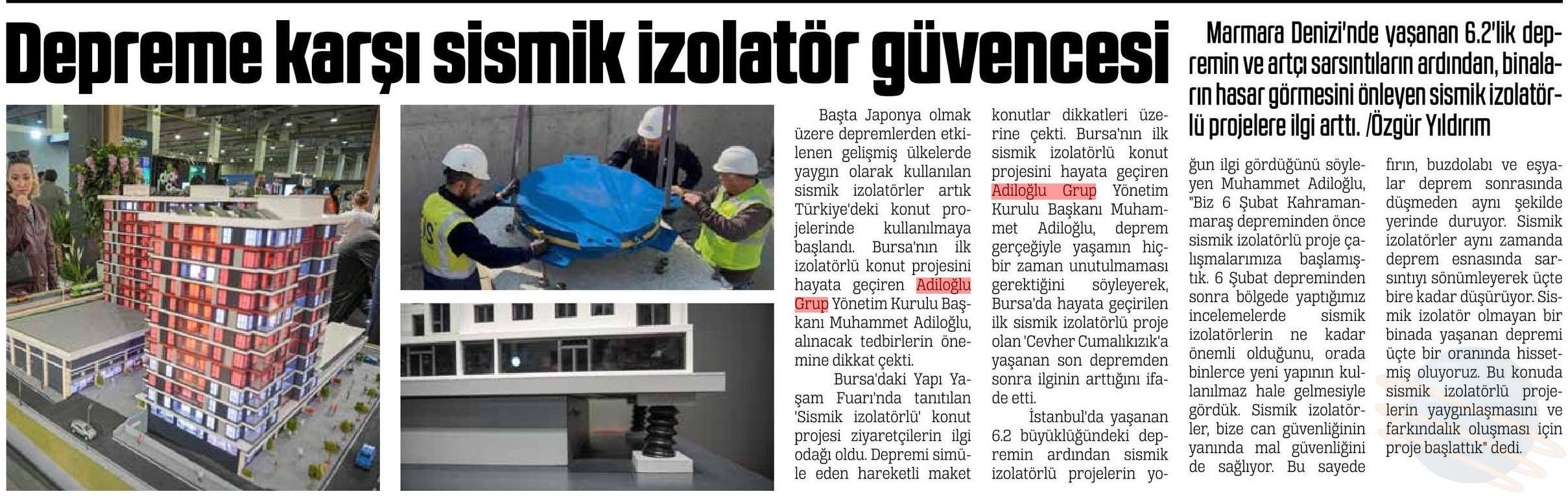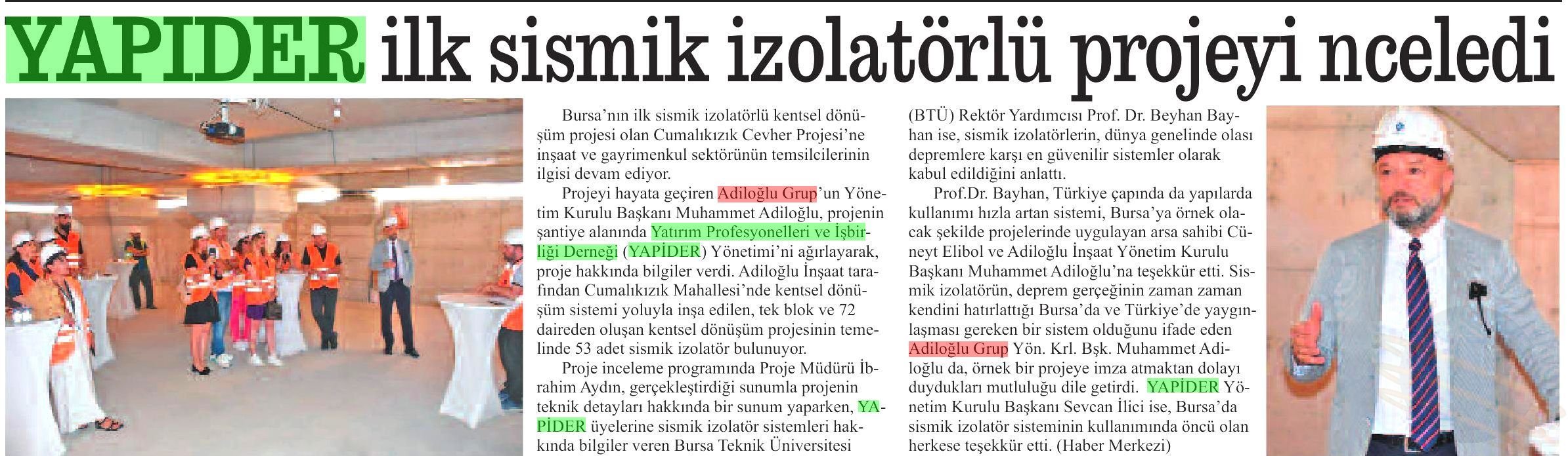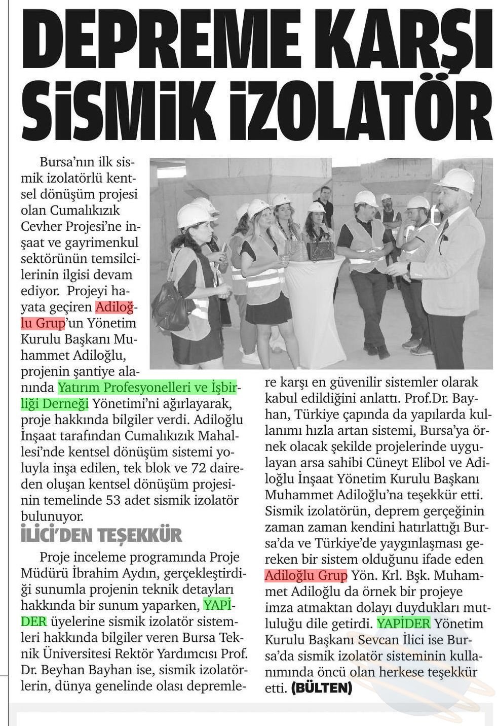 Projeyi hayata geçiren Adiloğlu Grup’un Yönetim Kurulu Başkanı Muhammet Adiloğlu, projenin şantiye alanında Yatırım Profesyonelleri ve İşbirliği Derneği (YAPİDER) Yönetimi’ni ağırlayarak, proje hakkında bilgiler verdi. Adiloğlu İnşaat tarafından Cumalıkızık Mahallesi’nde kentsel dönüşüm sistemi yoluyla inşa edilen, tek blok ve 72 daireden oluşan kentsel dönüşüm projesinin temelinde 53 adet sismik izolatör bulunuyor.