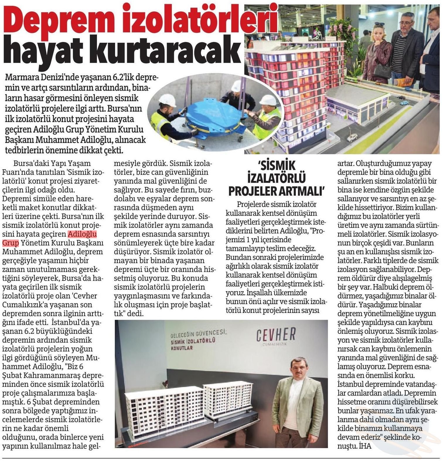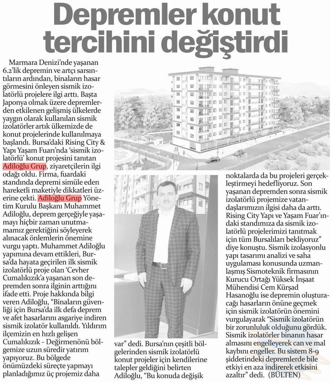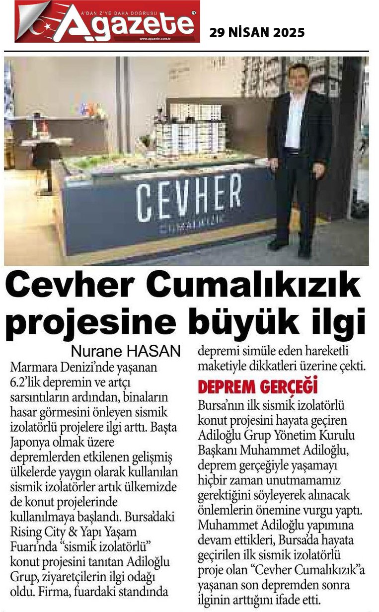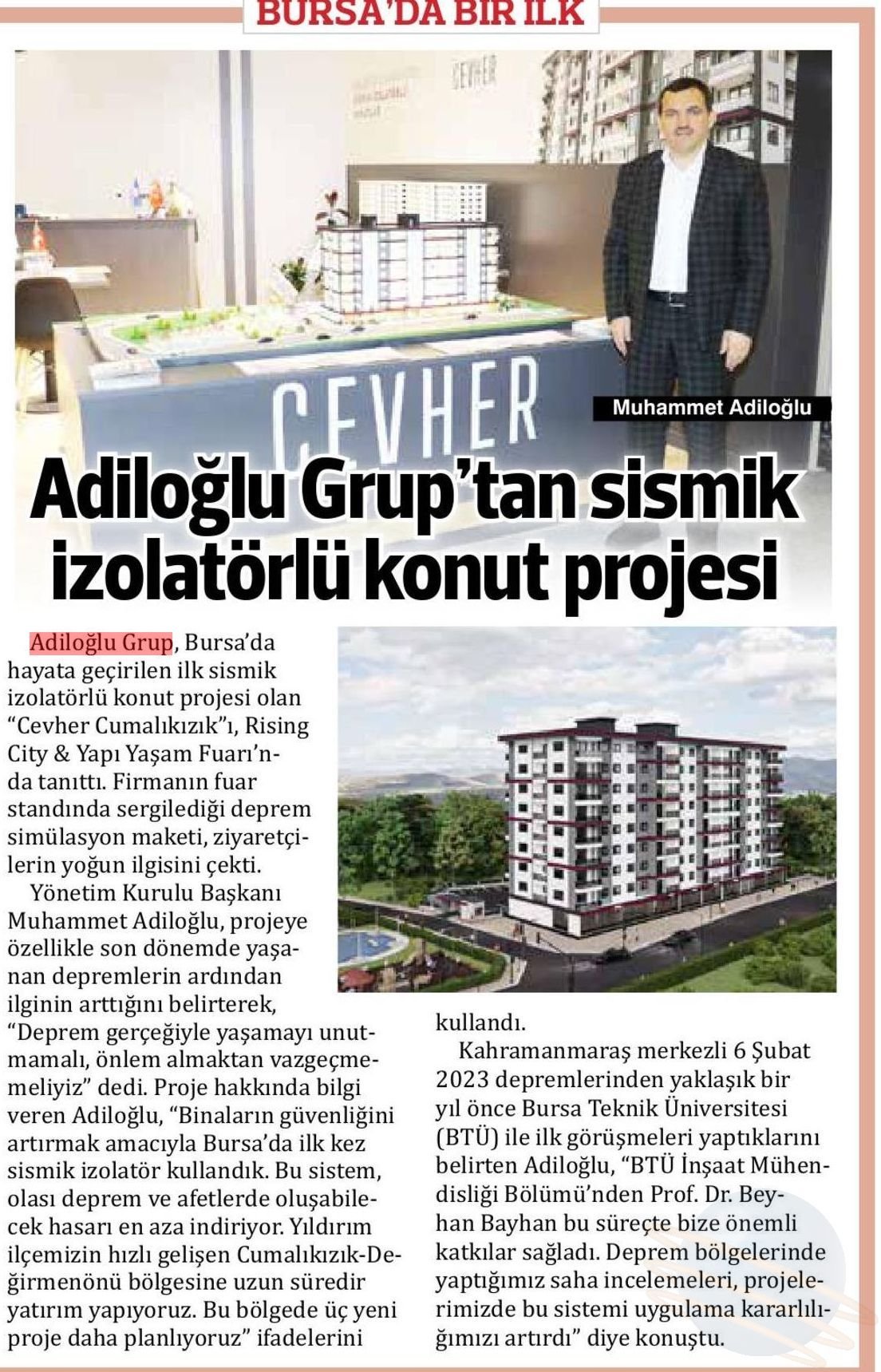 Bursa'daki Rising City & Yapı Yaşam Fuarında 'sismik izolatörlü' konut projesini tanıtarak ziyaretçilerin ilgi odağı olduk. Fuardaki standımızda depremi simüle eden hareketli maketimiz dikkatleri üzerine çekti. Yönetim Kurulu Başkanımız Muhammet Adiloğlu, deprem gerçeğiyle yaşamayı hiçbir zaman unutmamamız gerektiğini söyleyerek alınacak önlemlerin önemine vurgu yaptı. Muhammet Adiloğlu yapımına devam edilen, Bursa'da hayata geçirilen ilk sismik izolatörlü proje olan 'Cevher Cumalıkızık'a yaşanan son depremden sonra ilginin arttığını ifade etti. Proje hakkında bilgi veren Adiloğlu, "Binaların güvenliği için Bursa'da ilk defa deprem ve afet hasarlarını asgariye indiren sismik izolatör kullanıldı. Yıldırım ilçemizin en hızlı gelişen Cumalıkızık - Değirmenönü bölgemize uzun süredir yatırım yapıyoruz” dedi.