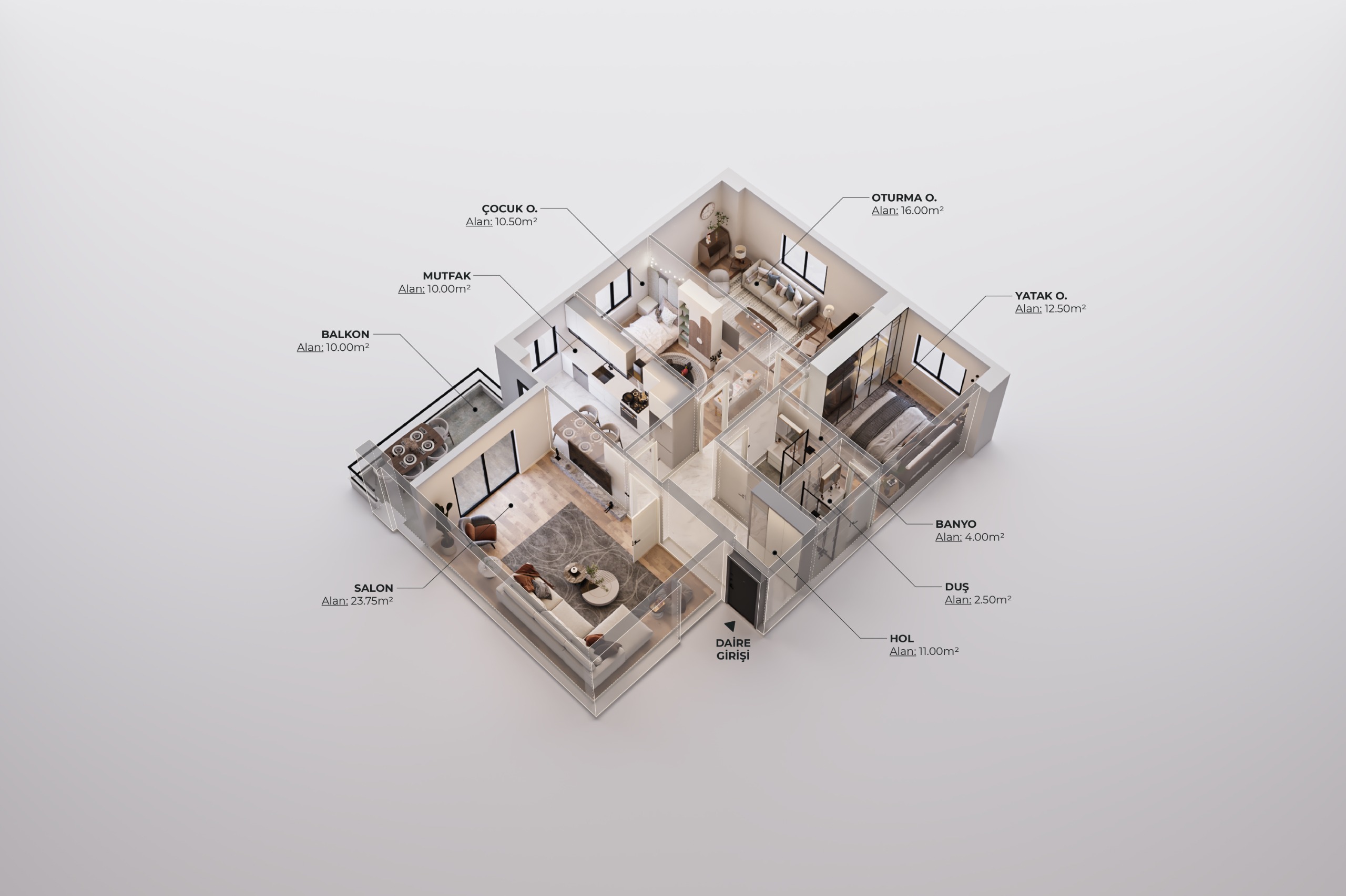 İki bloktan oluşan projede; 93 adet konut, ofis ve ticari ünite yer almaktadır. Toplam 12 kattan oluşan yapının 2 katı otopark, 3 katı ticari alan, 8 katı ise konut ve ofis olarak planlanmıştır.
